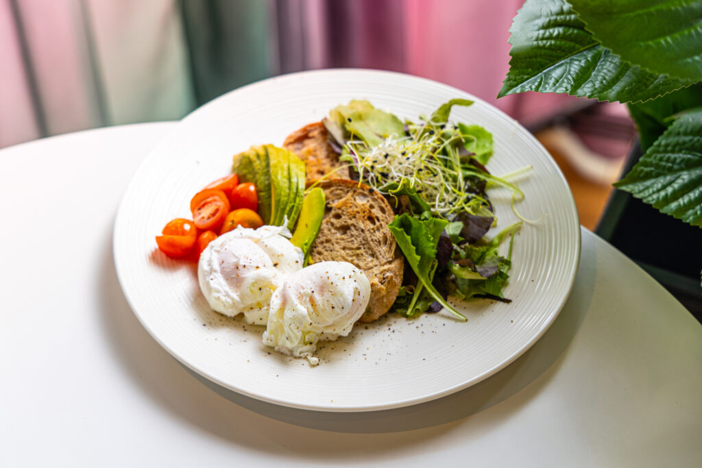 Pošeeritud munad 2tk, avokaado, värske salat, ciabatta