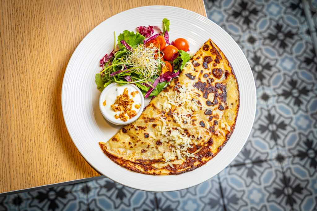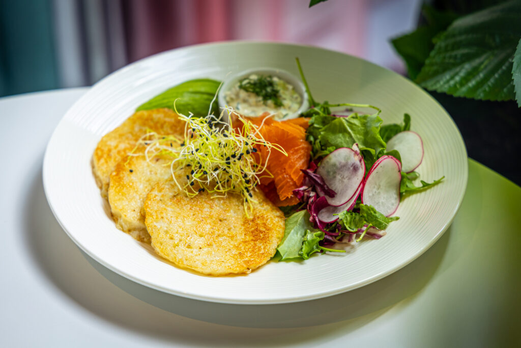 Kartulipannkoogid (3tk), avokaado, külmsuitsulõhe, salat, kaste