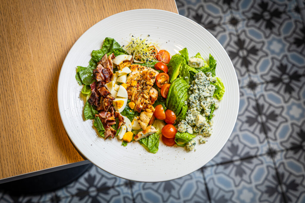 Rooma salat, kanafilee, peekon, muna, kirsstomatid, avokaado, sinihallitusjuust