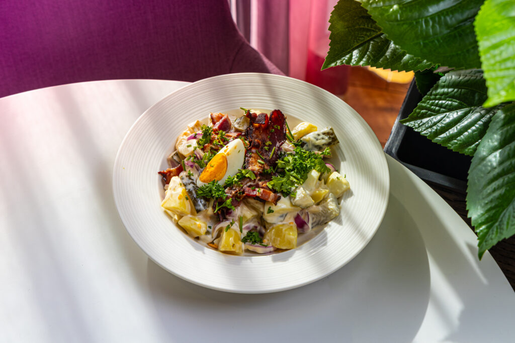 Kartul, peekon, marineeritud kurk, muna, majonees