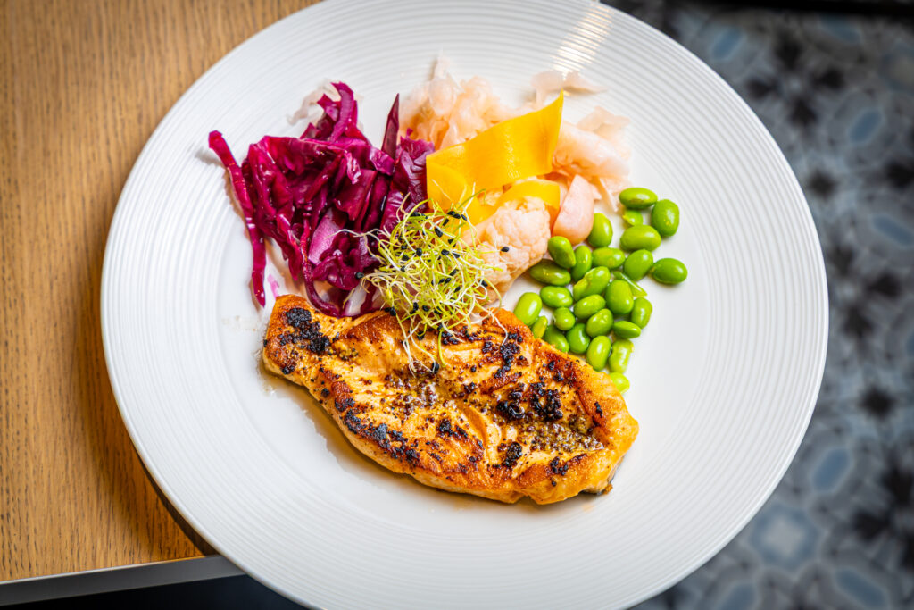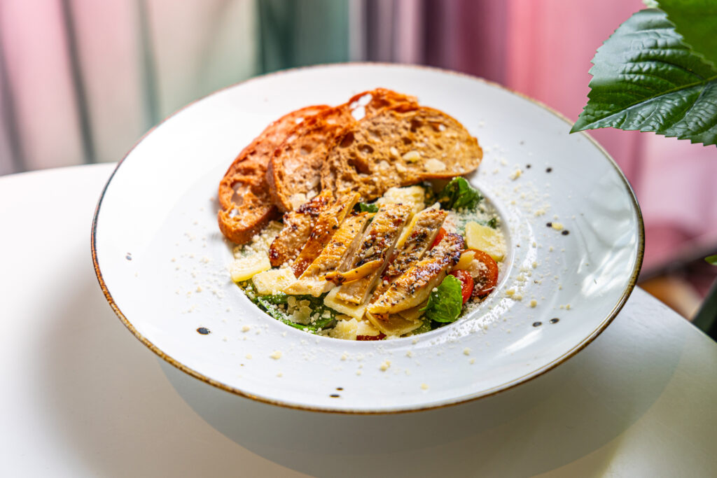 Rooma salat, kirsstomatid, forte juust, caesari kaste, ciabbata, kanafilee