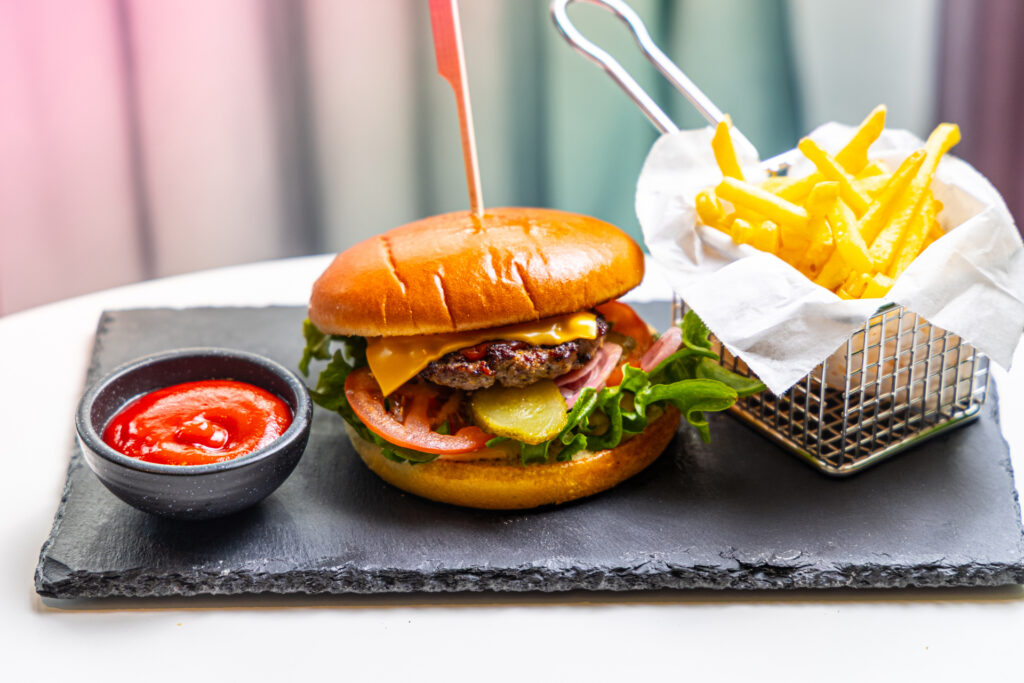 friikartulitega ja aioli kastmega (brioche sai, käsitöö veiselihapihv, salat, mar. sibul, tomat, salat, mar. kurk)