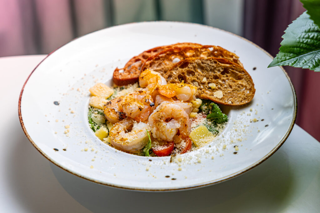Rooma salat, kirsstomatid, forte juust, caesari kaste, ciabbata, tiigerkrevetid