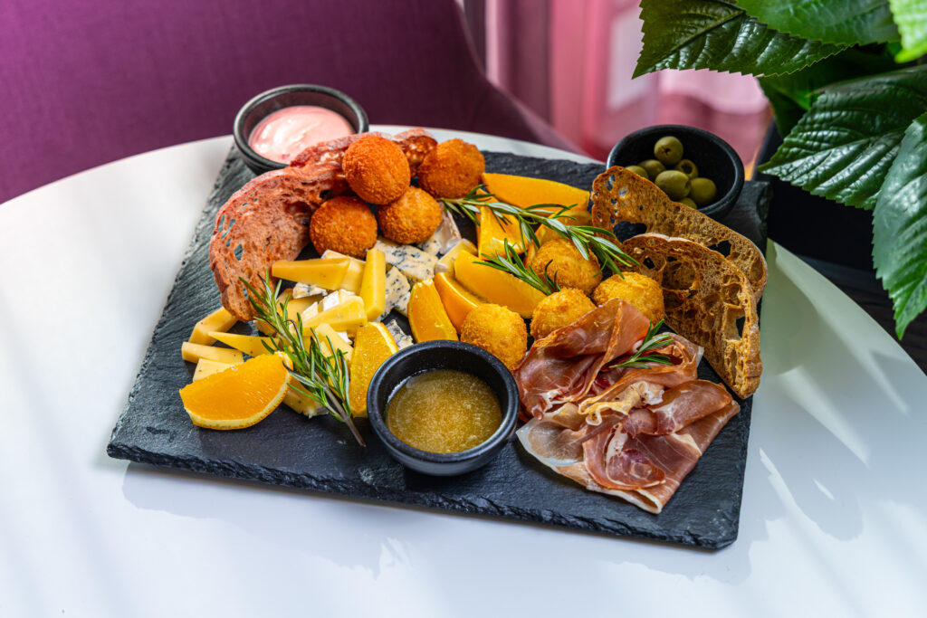 Juustuvalik, juustupallid, oliivid, parma sink, ciabatta